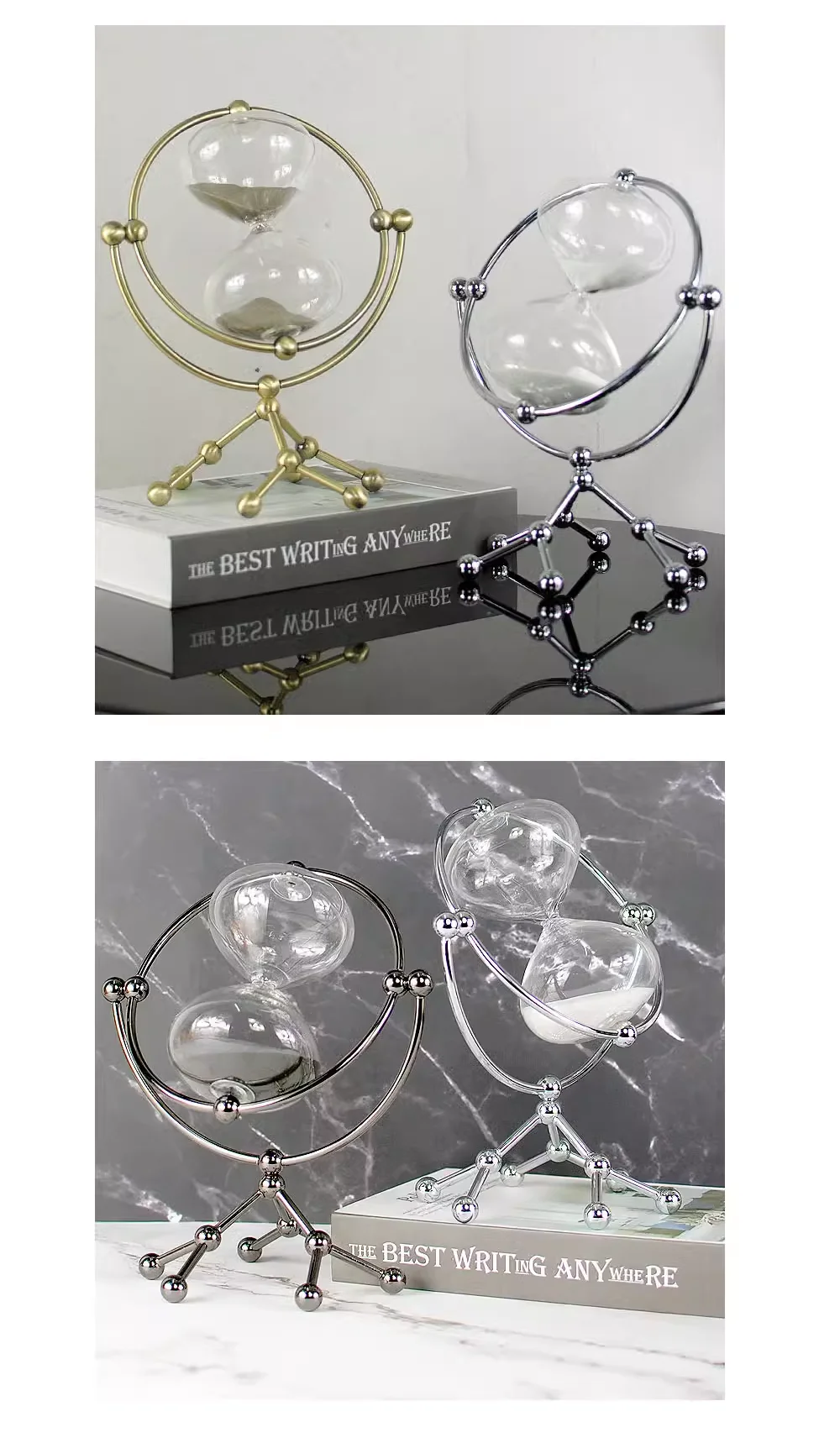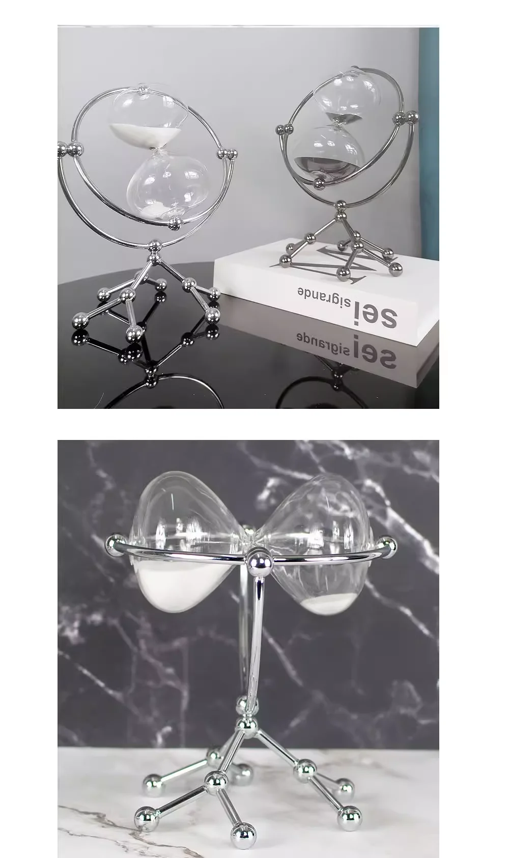 The hourglass lasts about 30 minutes, and the metal part connected to the hourglass can rotate.