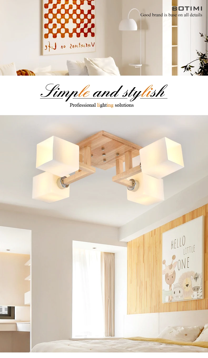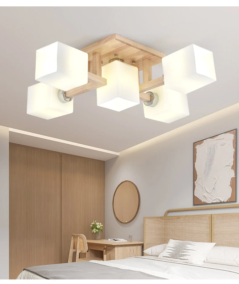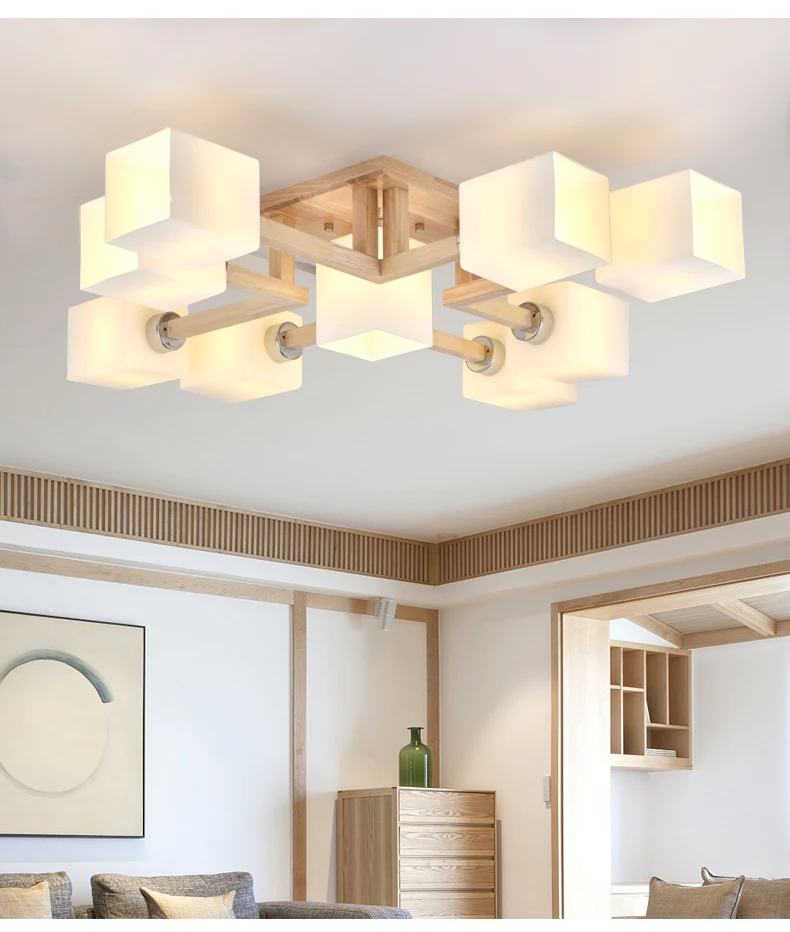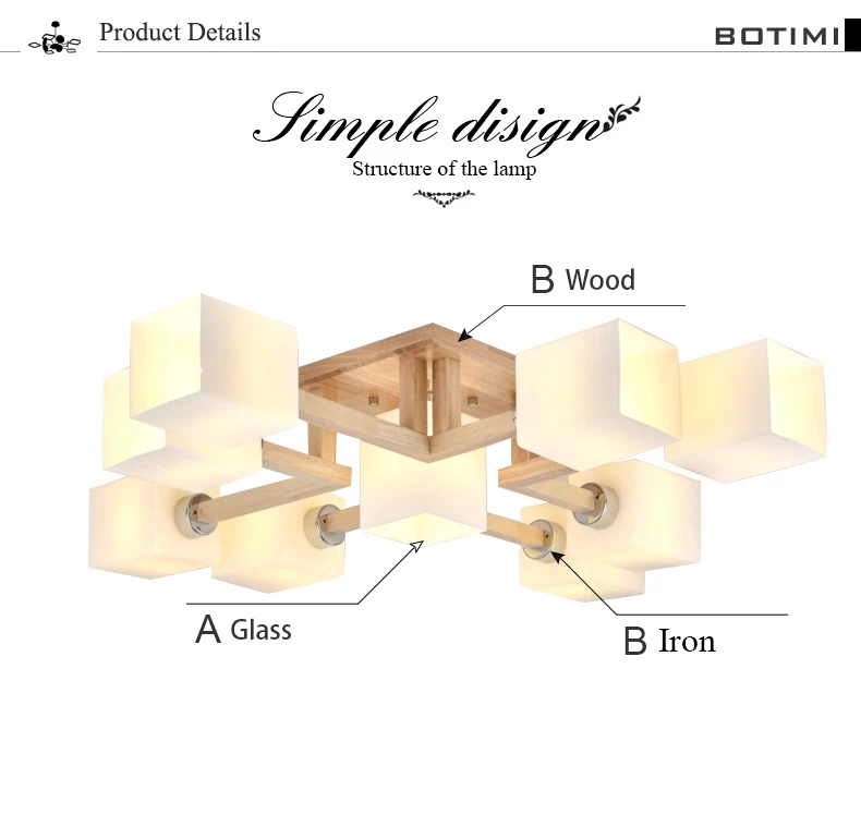 BOTIMI Natural Wooden Ceiling Lights For Living Room Cube Glass Lampshades Ceiling Mounted Bedroom Lustres Modern Dinning Lamp