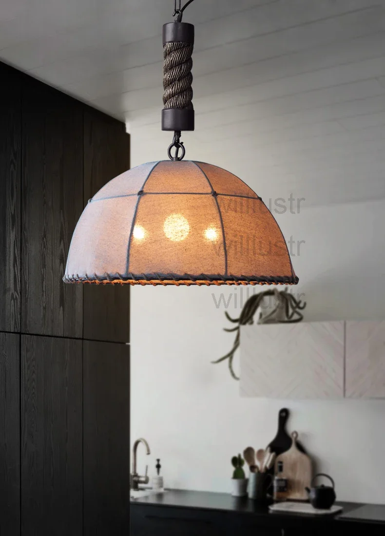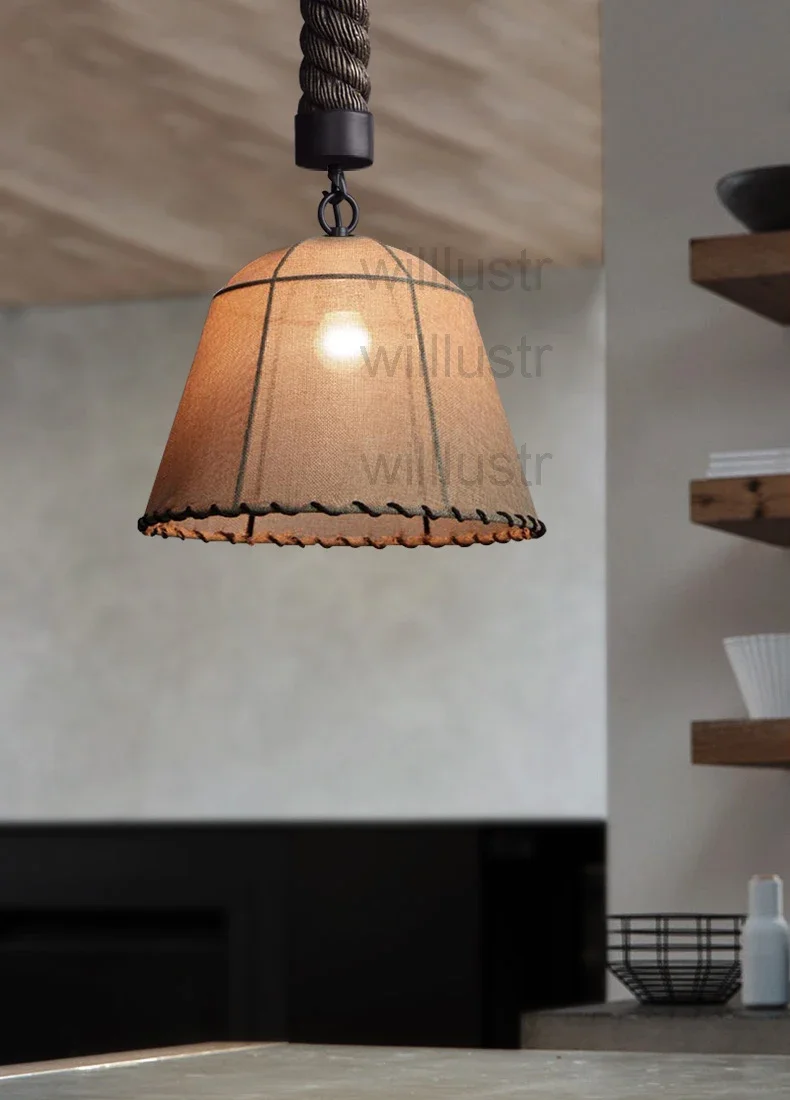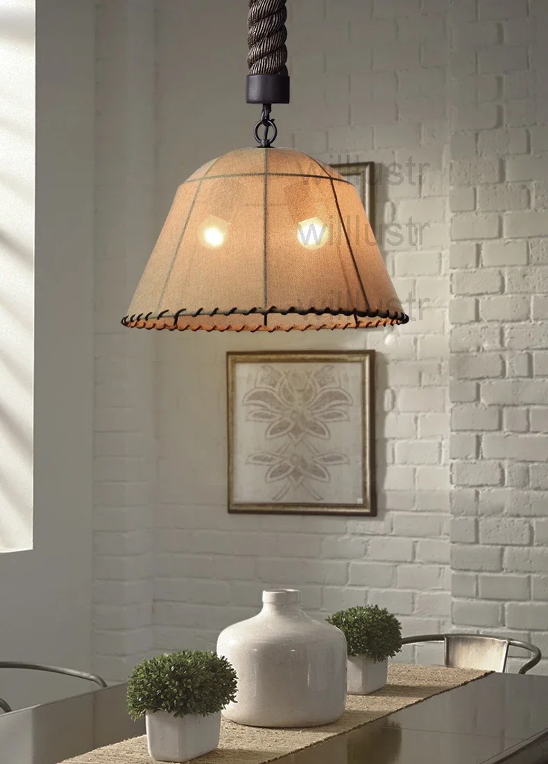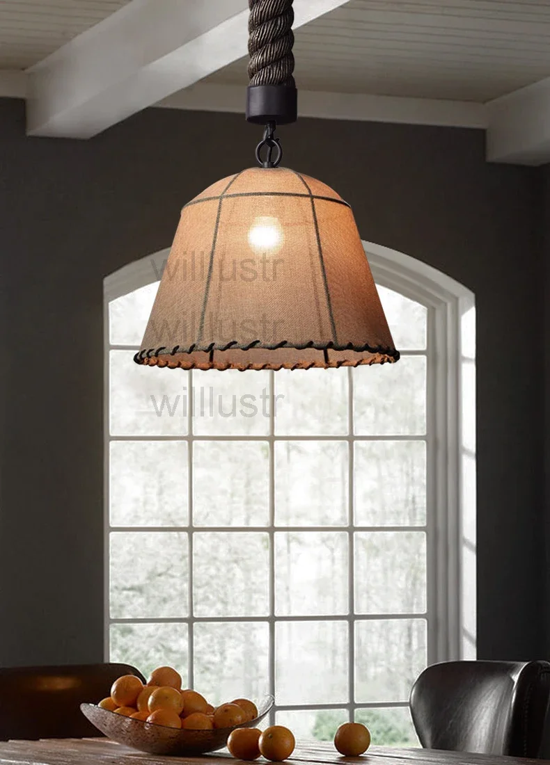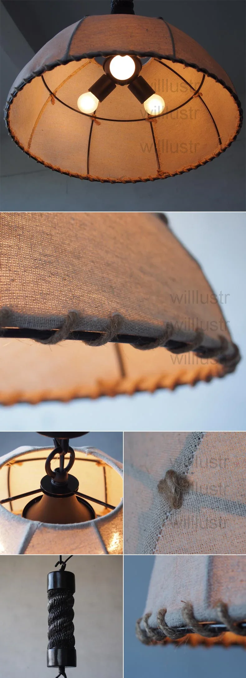 Linen Cloth Shade Pendant Lamp American Hanging Ceiling Chandelier Fabric Suspension Light Hotel Restaurant Cafe Bar Living Room