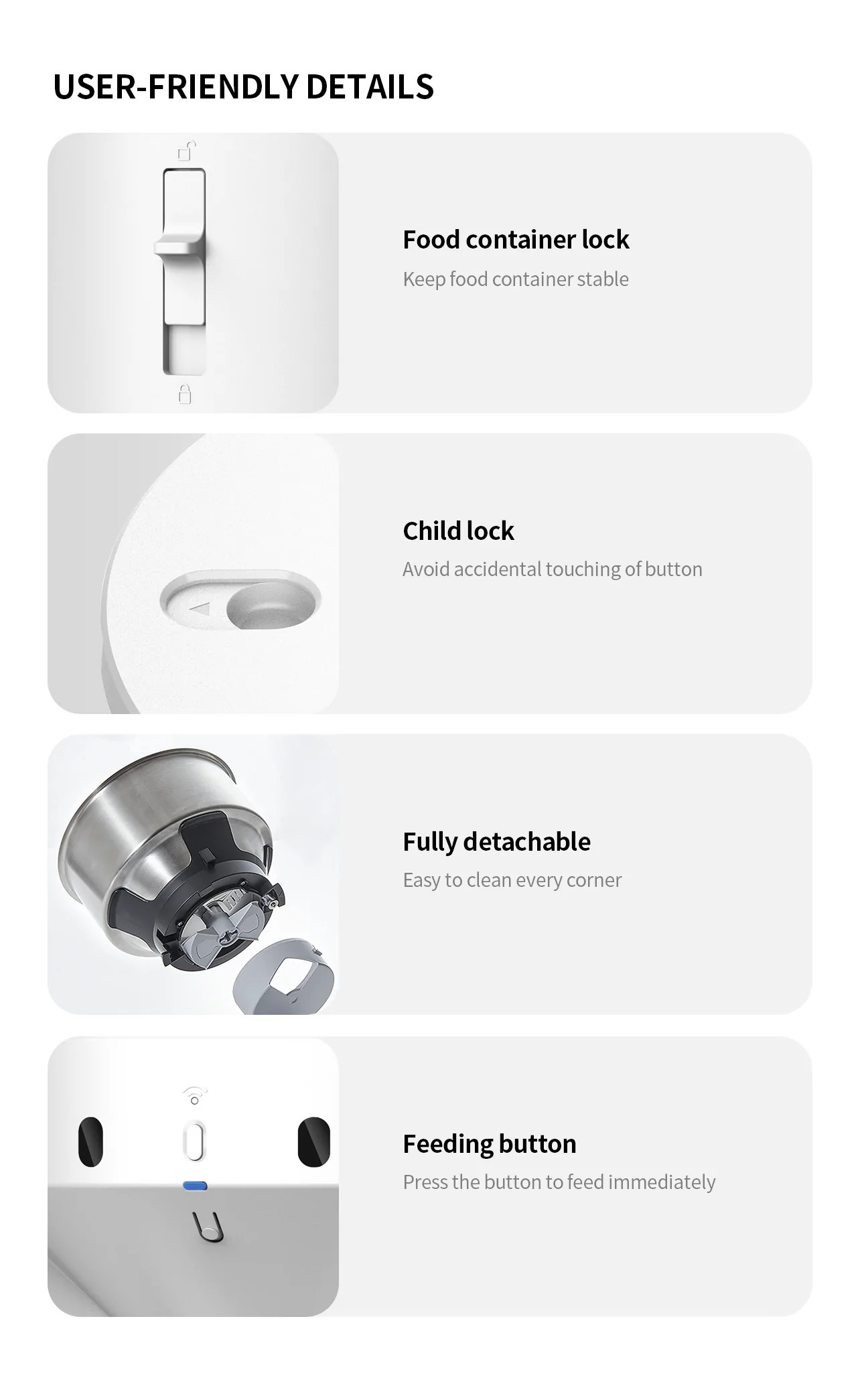 Anti-jam food, through the cooperation of the mixing tablet and the silicone special-shaped impeller, the food can be fed smoothly and avoid the food jam.