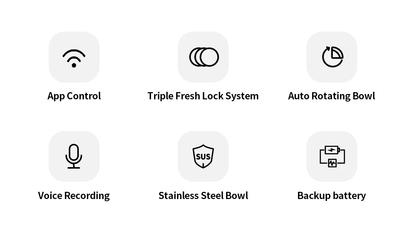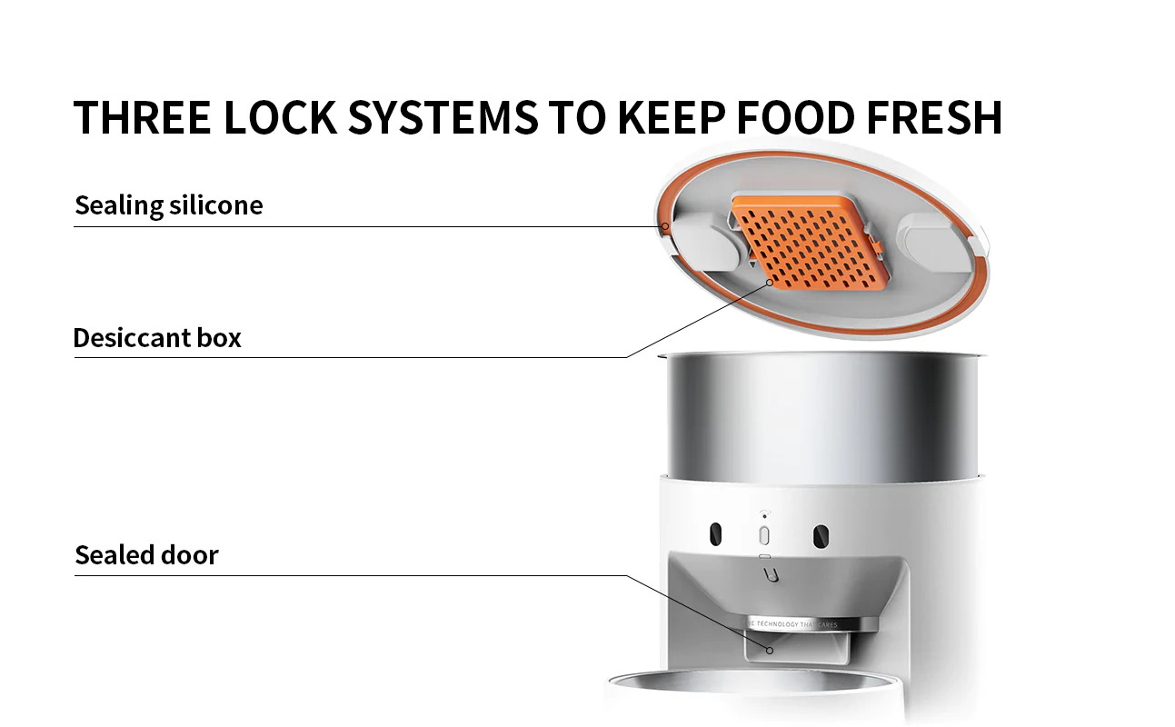 Triple lock fresh design, the food is fresh and delicious. First, the top cover is embedded with a silicone seal to isolate the air and prevent particle oxidation. The second is the grain storage barrel desiccant box, the desiccant package is dehumidified and dehumidified, and it is replaced regularly. The third is a hidden food outlet, which is sealed in time after the food is delivered to prevent pets from being bitten.