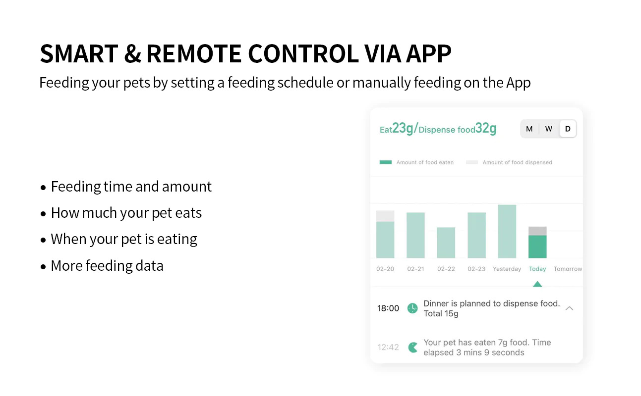 APP data monitoring, a comprehensive understanding of the pet's eating status. The APP displays the number of grams of food delivered and the number of remaining grams, and can also count the number of grams the pet has eaten.