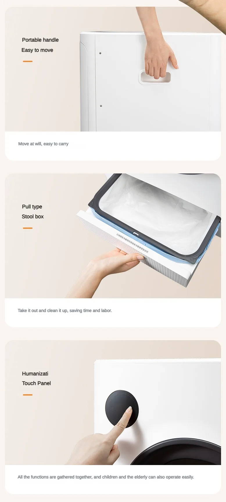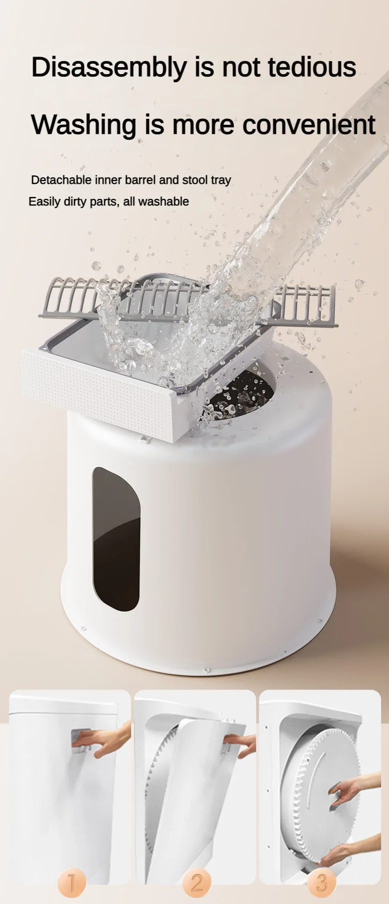 Removable and easy-to-dirty parts of inner barrel and toilet tray, all washable