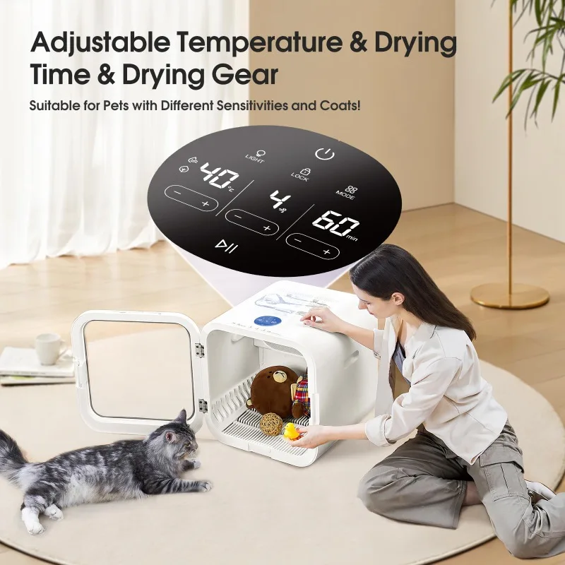 【Tailored Drying Options - Ideal for Various Pets】This drying box for cat features an adjustable temperature range of 15-45 degrees, a flexible drying time of 15-90 minutes, and drying gears from 1-4;Personalize your pet's dryer experience by customizing temperature, drying time,and drying gear. Enhance the drying experience for your fur baby greatly!