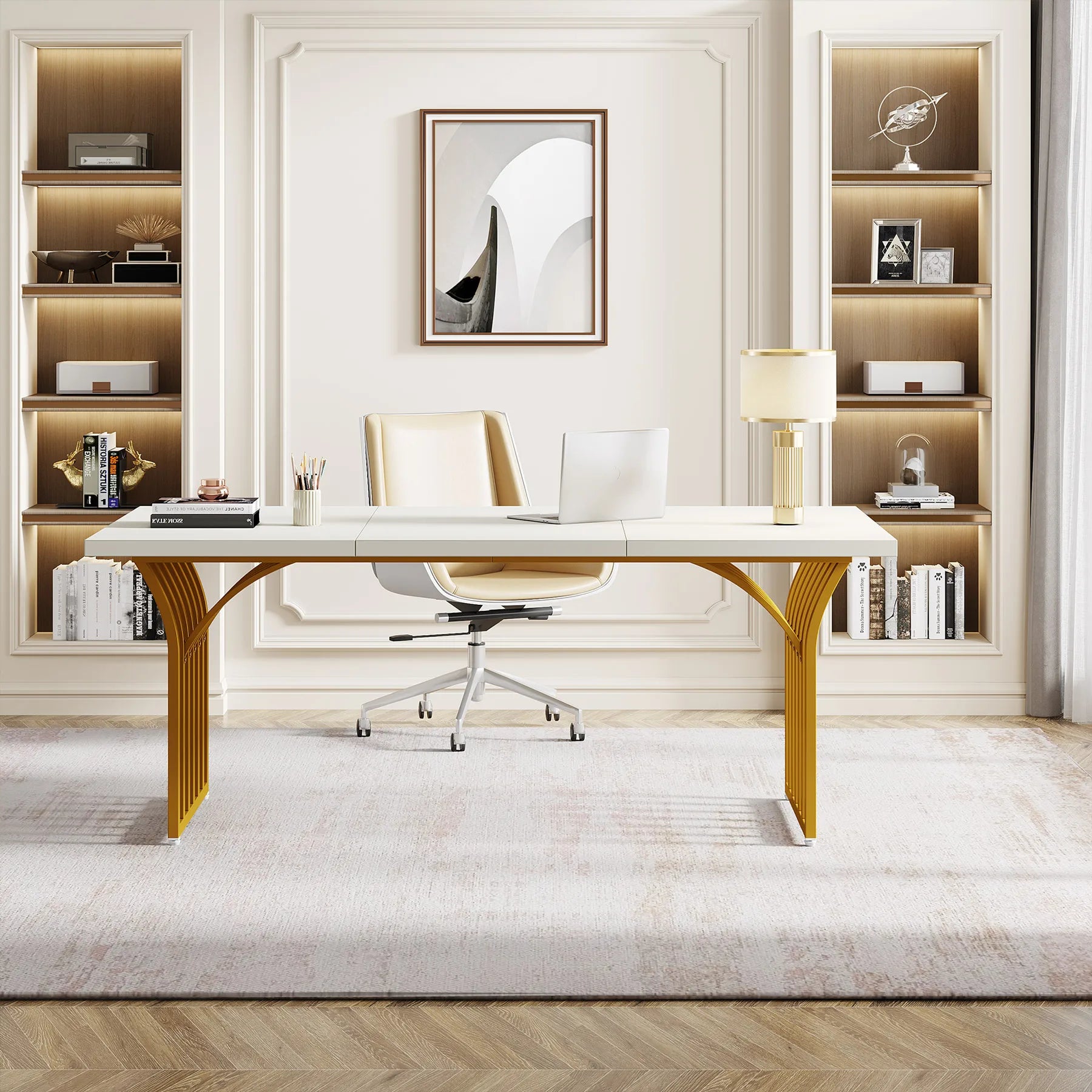 【Durable Executive Desk】Crafted with a sturdy metal frame and a 1.57" thickened MDF desktop, this white executive desk is built to last. Its robust construction makes it a perfect addition to both your home and office. Furthermore, the scratch- resistant laminate finish ensures that it can withstand the rigors of everyday use, while retaining its sleek appearance for years to come.